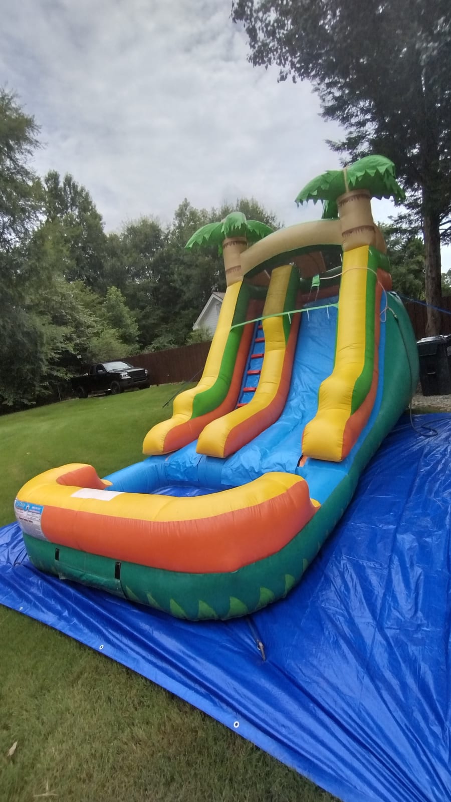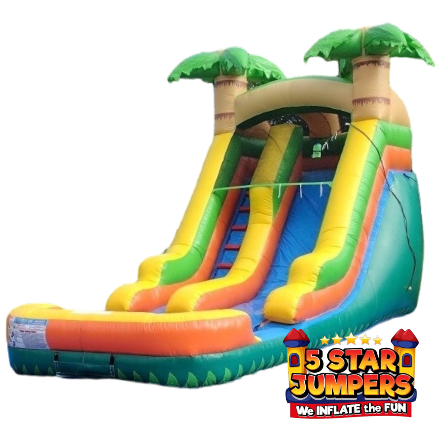 Make a splash at your next event with our vibrant 14-foot "Tropical Adventure" Water Slide. 🌴 Designed to bring the ultimate thrill, this yellow, green, and orange slide features playful palm trees and a refreshing pool at the bottom. Kids absolutely love it, making it the #1 rental choice for 2023! 🎉